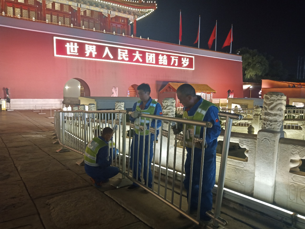 閱兵及群眾慶?;顒?dòng)結(jié)束后,10月2日從凌晨1點(diǎn)開(kāi)始到6點(diǎn)半結(jié)束,從早上7點(diǎn)半到10點(diǎn)結(jié)束,組織近500人分別完成天安門(mén)及廣場(chǎng)周邊地區(qū)、金水橋護(hù)欄全面恢復(fù)。