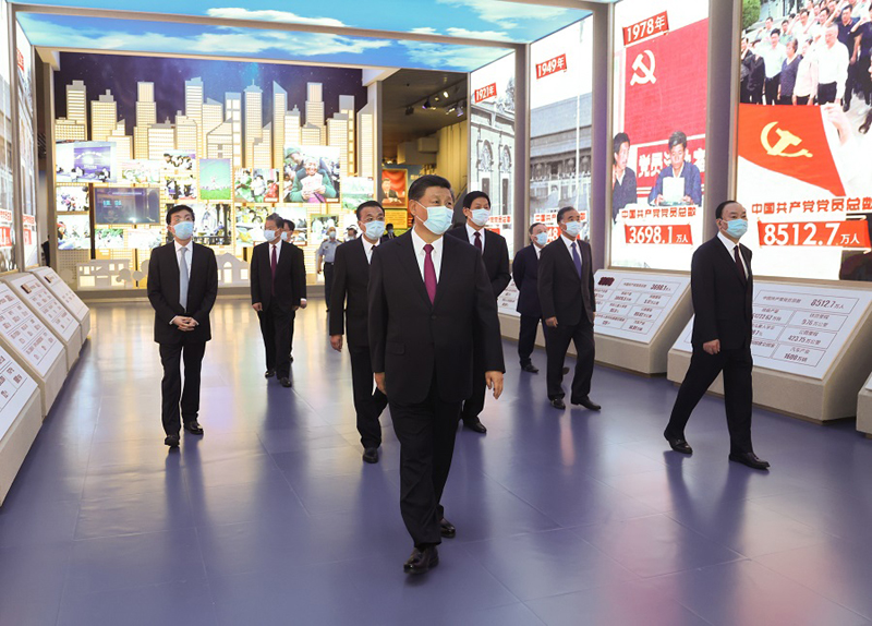 新近落成的中國共產(chǎn)黨歷史展覽館巍然矗立,氣勢恢宏。下午3時20分許,習近平等黨和國家領導同志來到這里,步入展廳參觀展覽。展覽以“不忘初心、牢記使命”為主題,精心設計了“建立中國共產(chǎn)黨 奪取新民主主義革命偉大勝利”、“成立中華人民共和國 進行社會主義革命和建設”、“實行改革開放 開創(chuàng)和發(fā)展中國特色社會主義”、“推進中國特色社會主義進入新時代 全面建成小康社會 開啟全面建設社會主義現(xiàn)代化國家新(人民日報)征程”4個部分,通過2600余幅圖片、3500多件套文物實物,第一次全方位、全過程、全景式、史詩般展現(xiàn)中國共產(chǎn)黨波瀾壯闊的百年歷程,濃墨重彩地反映黨的不懈奮斗史、不怕犧牲史、理論探索史、為民造福史、自身建設史,使人們深刻認識到紅色政權來之不易、新中國來之不易、中國特色社會主義來之不易,深刻認識到中國共產(chǎn)黨為什么能、馬克思主義為什么行、中國特色社會主義為什么好。