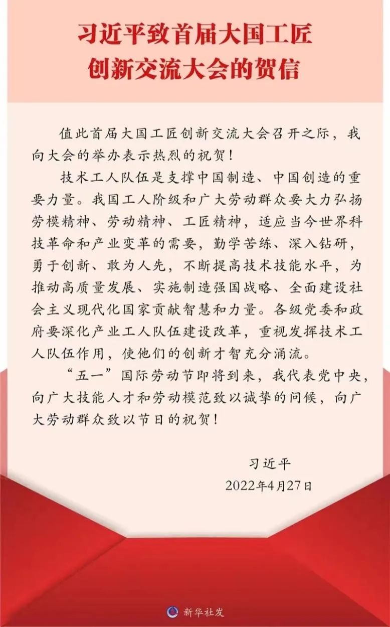2022年4月27日,由中華全國總工會主辦,廣東省總工會、深圳市人民政府、中國職工技術(shù)協(xié)會承辦,各省、自治區(qū)、直轄市和各全國產(chǎn)業(yè)工會組織所屬單位參加的首屆大國工匠創(chuàng)新交流大會(以下簡稱“大會”)在北京開幕。中共中央總書記、國家主席、中央軍委主席習(xí)近平發(fā)來賀信,向大會的舉辦表示熱烈的祝賀,并在“五一”國際勞動節(jié)到來之際,代表黨中央向廣大技能人才和勞動模范致以誠摯的問候,向廣大勞動群眾致以節(jié)日的祝賀。