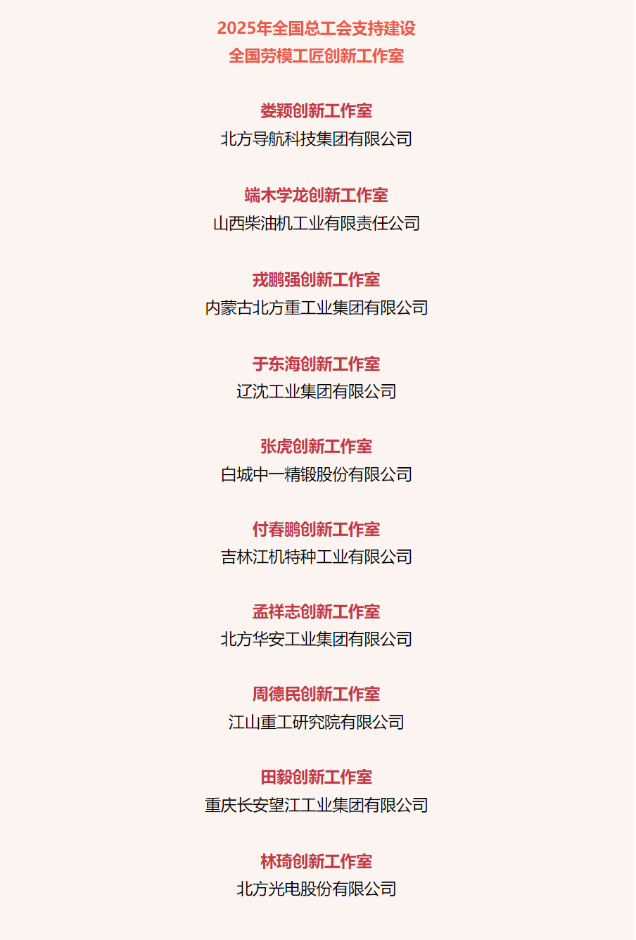 近日,中華全國總工會公布2025年全國總工會支持建設(shè)全國勞模工匠創(chuàng)新工作室名單,兵器工業(yè)集團10個勞模工匠創(chuàng)新工作室獲全國總工會支持建設(shè)。